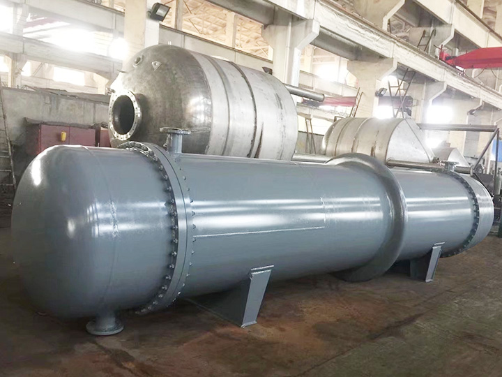 列管式换热器是目前化工及酒精生产上应用最广的一种换热器。它主要由壳体、管板、换热管、封头、折流挡板等组成。所需材质 ,可分别采用普通碳钢、紫铜、或不锈钢制作。在进行换热时,一种流体由封头的连结管处进入,在管流动,从封头另一端的出口管流出,这称之管程;另-种流体由壳体的接管进入,从壳体上的另一接管处流出,这称为壳程列管式换热器。