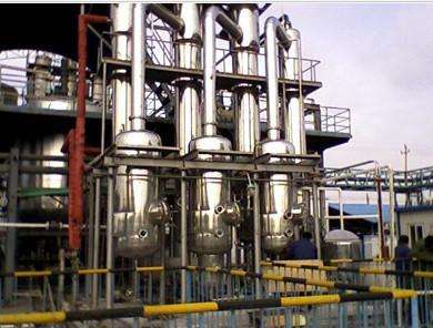 工作时,原料液由进料泵进入,经流量计、调节阀进入利用三效蒸发分离出来的二次蒸汽作为热源的预热器进行预热。约预热至50℃左右,之后进入二效蒸发器,物料在二效蒸发器内与二效加热器循环加热过程中不断蒸发,达到一定浓度,利用二效与三效间的压力差,物料以额定流量进入三效蒸发结晶器,物料在三效蒸发结晶器内与二效加热蒸发器相同方式进行不断加热蒸发,达到一定浓度,物料进入三效出料逆流泵,逆流泵出来的物料调节额定流量进入一效加热蒸发结晶器,在强制循环蒸发结晶室内经强制循环泵输送至加热器,加热后的料液循环进入蒸发分离室,物料在真空作用下,快速被蒸发,浓缩后的料液下行,在导流筒作用下减速自然沉降下行,在此过程中,过饱和溶液析出晶体,同时也在导流筒作用和锥底作用下,晶体往下沉淀至锥底部,经泡析腿由晶浆泵抽出,分离室边上清母液经循环管与强制循环泵循环至加热器,然后到蒸发分离器,如此不断循环蒸发,母液不断被蒸发析出晶体,待稳定后,根据析出晶体量调整出料晶浆泵流量,同时调整进料量,以达到与出料量和蒸发量的平衡,这时即可进行连续进出料。